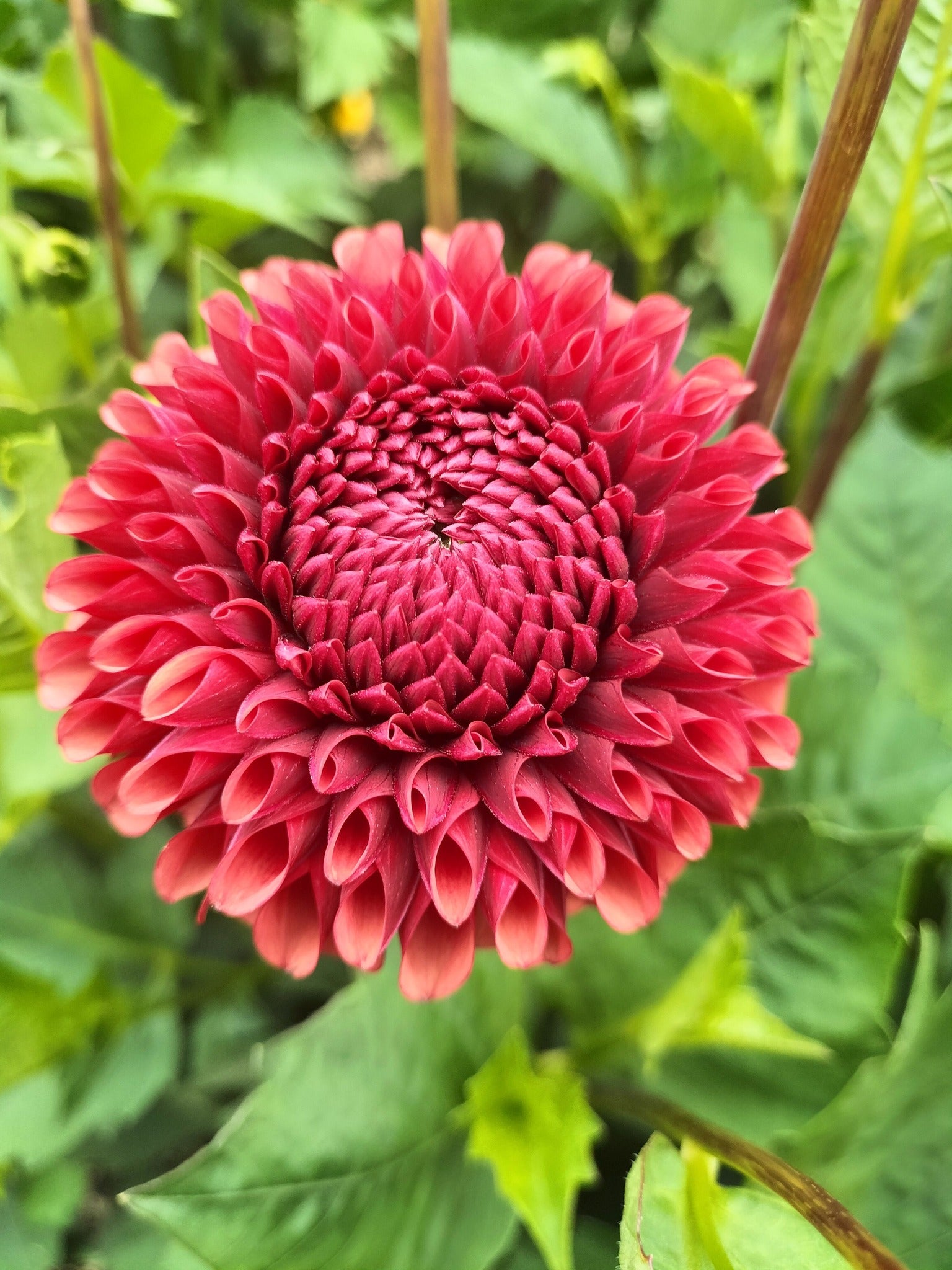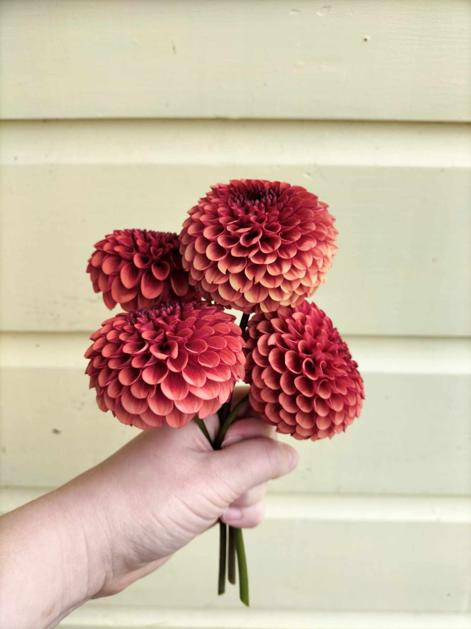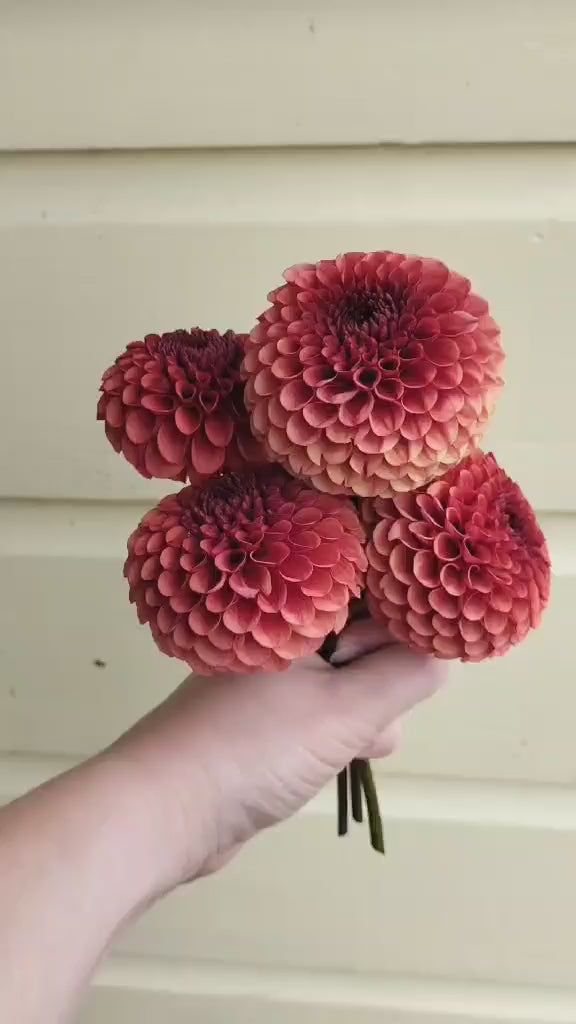 This dahlia forms a perfect sphere with a gradual fading from rich red, rusty red to copper colouration. A must have.